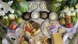 酒、水、お茶、盛花、重箱(おかず)×2個、重箱(餅)×2個、果物×2皿、ムイグヮーシ(盛り菓子)×2皿、精進料理、ダーグ(団子)×2皿、ハーガー(2種菓子)×2皿、線香、ウチカビ(あの世のお金)、シルカビ(習字紙)